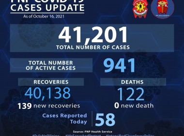 (Eagle News) — COVID-19 cases among police personnel rose to 41,201 on Saturday, Oct. 16, after the Philippine National Police reported 58 more cases. According to the PNP, of the total cases 941 were active. Recoveries rose to 40138 with the addition of 139 new ones. The PNP COVID-19 death toll remains at 122, with no additional deaths reported. The police are among the country’s frontliners amid the COVID-19 pandemic. In previous speeches, President Rodrigo […]