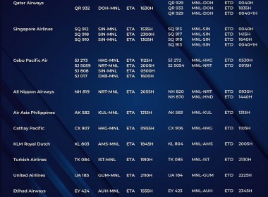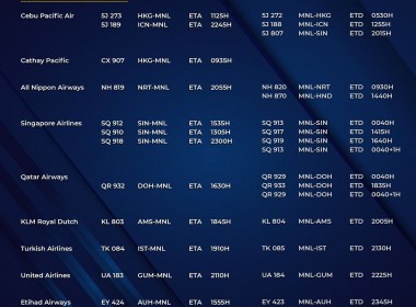 (Eagle News) — The Manila International Airport Authority has released its list of operational commercial flights for Thursday, Oct. 14: Flight schedules may change at any given time. MIAA advised passengers to coordinate with their airlines and secure confirmation of their flights prior to the scheduled travel. According to MIAA, only those with the confirmation will be allowed entry into the airport. The Palace earlier said only Bermuda was so far on its updated red […]