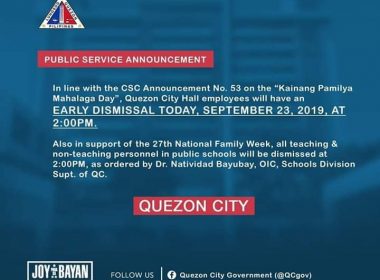 (Eagle News)–Work in the Quezon City hall is suspended today, Sept. 23, starting 2 p.m. In a Facebook post, the Quezon City government said work of teaching and non-teaching personnel in the city’s public schools is likewise suspended starting that time. The QC government said this was in support of the 27th National Family Week, in line with the Civil Service Commission Announcement No. 53 on the Kainang Pamilya Mahalaga Day. “Umuwi po tayo nang […]