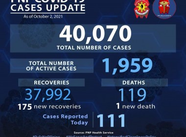 (Eagle News)–Over 100 more COVID-19 cases have been reported among police personnel. The Philippine National Police said the additional 111 cases pushed the PNP COVID-19 total to 40070. Of these, 1959 are active. Recoveries rose to 37992 with the additional 175 recoveries. The PNP COVID-19 death toll is now at 119 with the additional death. The PNP has said eight out of ten policemen are fully vaccinated. PNP Chief Guillermo Eleazar received his first vaccine […]