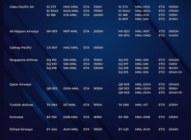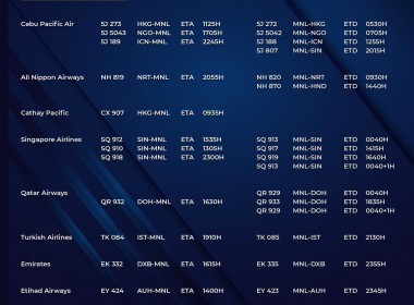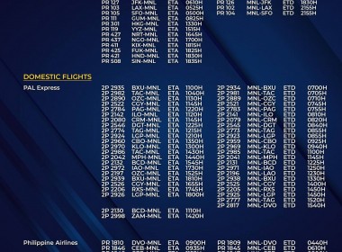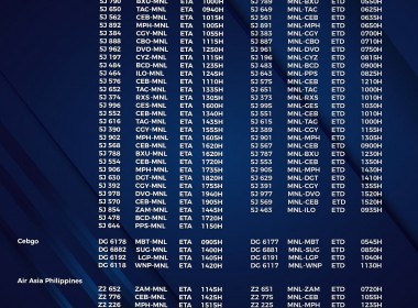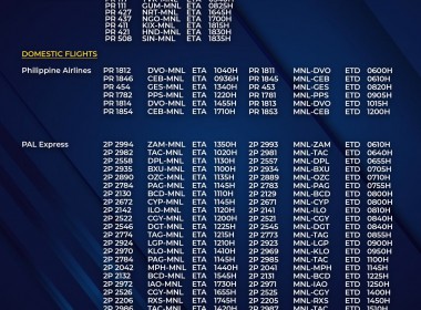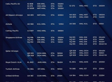 (Eagle News) — The Manila International Airport Authority has released its list of operational commercial flights for Saturday, Oct. 9: Flight schedules may change at any given time. MIAA advised passengers to coordinate with the airlines prior to the scheduled travel. It said only those with the confirmation will be allowed entry into the airport. Earlier, the Bureau of Immigration reminded foreign nationals that appropriate visas need to be secured for entry into the Philippines. […]
