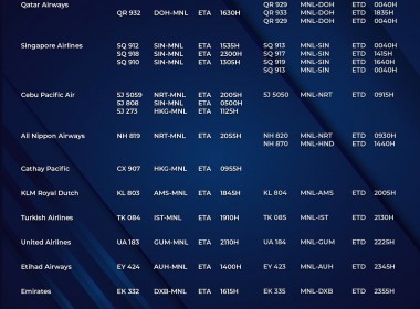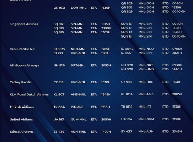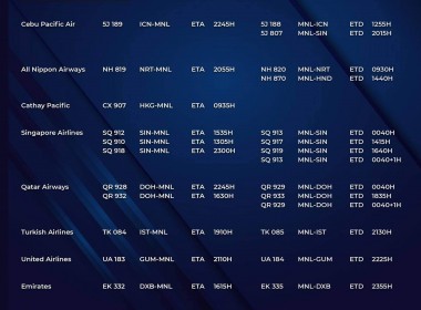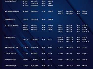 (Eagle News)–The Manila International Airport Authority has released its list of operational commercial flights for Saturday, Sept. 11: MIAA advised passengers to coordinate with their airlines prior to the scheduled flight as schedules are subject to changes. The Philippines has lifted the ban on India, Pakistan, Omar, the United Arab Emirates, Nepal, Indonesia, Thailand, Malaysia, Bangladesh and Sri Lanka. International travelers from those countries, however, need to comply with the appropriate entry, testing and quarantine […]