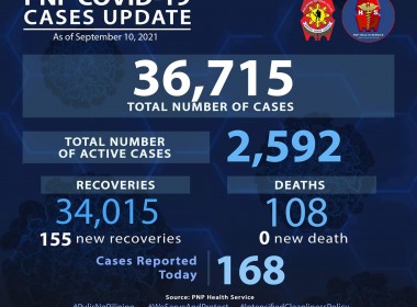 (Eagle News) — Over 100 more COVID-19 cases have been reported among police personnel. According to Philippine National Police data as of September 10, the additional 168 cases pushed the total COVID-19 cases to 36715. Of these, 2592 are active. Recoveries also rose to 34015, with the addition of 155 recoveries. The COVID-19 death toll among police personnel is at 108, with no additional deaths reported. The PNP has said over 40 percent of the […]