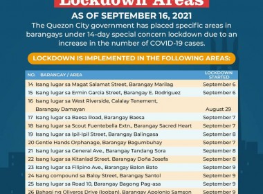 (Eagle News) — Over 50 areas in Quezon City have been placed under a special concern lockdown due to an increase in COVID-19 cases, the local government announced on Friday, Sept. 17. As of September 16, the local government said the following areas are under a lockdown that will last for 14 days from the start of the lockdown implementation in each area: According to the local government, it will distribute food packs and essential […]