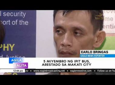 (Eagle News) — Limang suspek ang naaresto ng mga otoridad matapos na biktimahin ang isang pampasaherong bus sa Buendia area Huwebes ng gabi, Enero 3. Nacorner ang mga mandurukot matapos na makapagsumbong ang mga complainant at makarating sa Makati City Police ang ginawang modus ng mga suspek. Kabilang sa naaresto ay ang lider ng grupo na kinilalang si Ruel Bautista alyas “Kokoy.” Modus ng mga suspek na libangin lahat ng mga pasahero ng mga bus […]