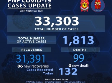 (Eagle News) — Over 100 more COVID-19 cases have been reported among police personnel. Philippine National Police data showed the additional 132 cases pushed the total PNP COVID-19 cases to 33303. Of these, 1813 are active. PNP recoveries also rose to 31391 including the additional 86 recoveries. The PNP COVID-19 death toll remains at 99, with no additional deaths reported. The COVID-19 vaccination of policemen is still ongoing. President Rodrigo Duterte had said uniformed personnel […]