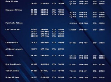 (Eagle News) — The Manila International Airport Authority has released its list of operational commercial flights for Wednesday, Aug. 18: Flight schedules may change at any given time. MIAA advised passengers to secure confirmation of their flights as only those with the confirmation will be allowed entry into the airport. The travel ban on India and nine other countries is still in effect. Metro Manila is under an enhanced community quarantine until Aug. 20.