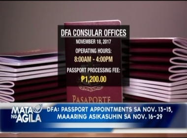 (Eagle News) — Hindi na kailangang magpa-reschedule ng passport application o renewal na nakatakda sa November 13 hanggang 15. Lahat ng appointment sa mga nasabing petsa ay aasikasuhin ng Department of Foreign Affairs (DFA) mula November 16 hanggang 29. Bukas ang DFA Consular Offices sa November 18, Sabado mula alas-otso ng umaga hanggang alas-kwatro ng hapon (8:00 AM-4:00 PM) at ang processing fee ay Php 1,200. Idineklarang special non-working holidays ang mga petsang November 13 […]