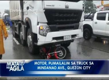 QUEZON CITY, Philippines (Eagle News) — Sa kasagsagan ng malakas na buhos ng ulan kahapon, Setyembre 12, pumailalim ang isang motorsiklo sa truck sa Mindanao Avenue, Quezon City. Ayon sa driver ng motorsiklo, magpapaayos sana siya ng sasakyan nang hindi niya napansin ang isang truck na nag-Uturn. Ayon naman sa driver ng truck, hindi rin aniya niya napansin ang motorsiklo dahilan upang pumailalim ito sa unahang bahagi ng truck. Nagtamo ng bali sa tuhod ang […]