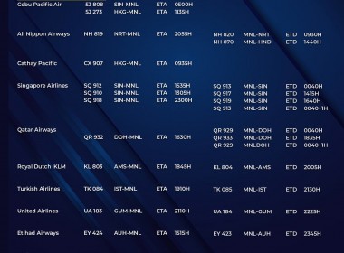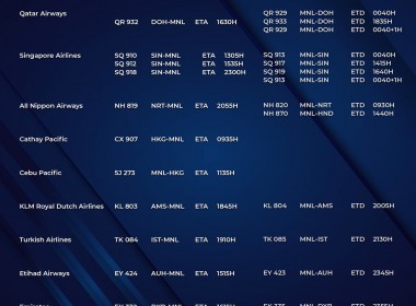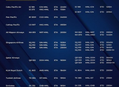 (Eagle News) — The Manila International Airport Authority has released its list of operational commercial flights for Saturday, July 24: MIAA said flight schedules may change at any given time. According to the Philippine government, the travel ban on passengers from India, Pakistan, Sri Lanka, Bangladesh, Nepal, Oman, and Bangladesh is in effect until July 31. The travel ban also now covers Indonesia. On Friday, the government included Malaysia and Thailand on its travel ban list. […]
