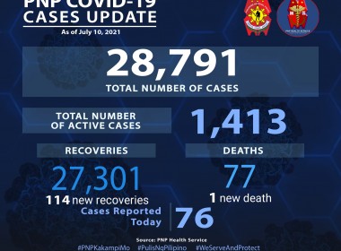 (Eagle News) — Seventy-six more COVID-19 cases have been reported among police personnel. The Philippine National Police said the additional cases pushed the PNP COVID-19 cases to 28791. Of these, 1413 were active. Recoveries rose to 27301 including the 114 new ones. An additional death also pushed the PNP COVID-19 death toll to 77. COVID-19 vaccination of police personnel is ongoing as part of the Philippines’ COVID-19 inoculation program that kicked off in March. PNP […]