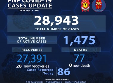 (Eagle News) — Eighty-six more police personnel have tested positive for COVID-19. The Philippine National Police said the additional cases pushed the PNP COVID-19 cases to 28943. Of these, the PNP said 1475 were active. Recoveries rose to 27391 including the 28 additional ones. The COVID-19 death toll among police personnel is still at 77, with no additional fatalities reported. The COVID-19 vaccination of members of the police force is still ongoing. President Rodrigo Duterte […]