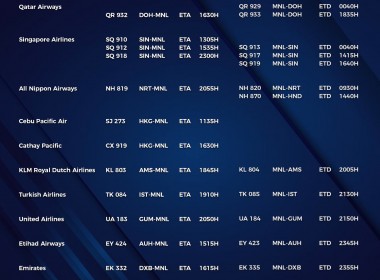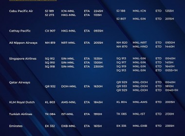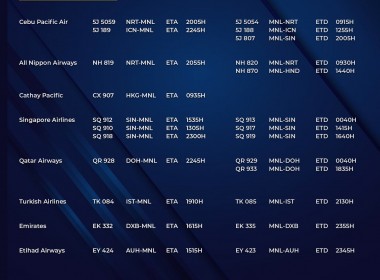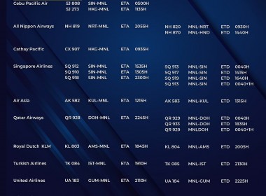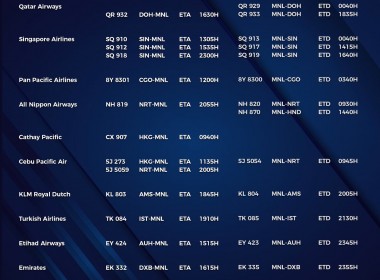 (Eagle News) — The Manila International Airport Authority has released its list of operational commercial flights for Sunday, July 11: MIAA advised passengers to get confirmation of their flights on the day of their supposed travel first before proceeding to the airport. It said flight schedules may be subject to changes. The travel ban on passengers from India, Pakistan, Sri Lanka, Nepal, Oman and the United Arab Emirates is still in effect until July 15. […]