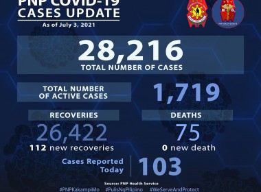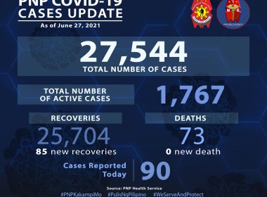(Eagle News) — The Philippine National Police has reported its 73rd COVID-19 fatality as COVID-19 vaccination of PNP personnel continues in a bid to protect them from the virus. In a statement, the PNP said the latest COVID-19 death was a 46-year-old police officer assigned in General Santos City. It said on June 24, the police officer went to a nearby hospital due to difficulty of breathing and on and off fever. The hospital conducted […]