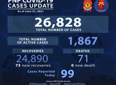 (Eagle News) — Ninety-nine more COVID-19 cases have been reported among police personnel. The Philippine National Police said the additional cases pushed the PNP COVID-19 total to 26828. Of these, 1867 were active. Recoveries rose to 24890, including the additional 75 ones. No additional death was reported, which means the death toll remains at 71. The police are among the country’s frontliners amid the COVID-19 pandemic. President Rodrigo Duterte has said the police and the […]