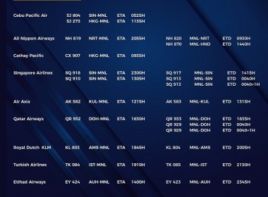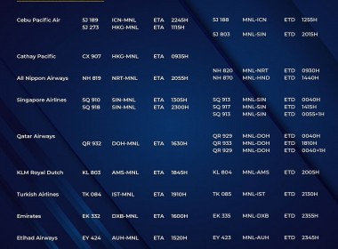 (Eagle News) — The Manila International Airport Authority has released its list of operational commercial flights for Saturday, June 12: Flight schedules may change at any given time. MIAA also advised passengers to secure confirmation of their flights as only those with the confirmation will be allowed entry into the airport premises. So far, travelers from India, Pakistan, Nepal, Bangladesh, Sri Lanka, Oman and the United Arab Emirates are banned from entering the Philippines until June […]