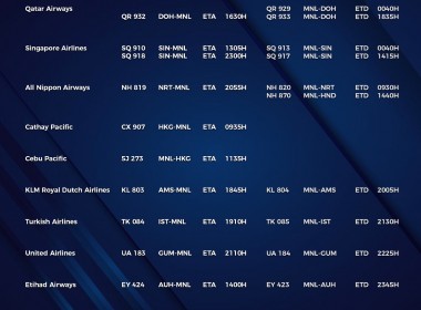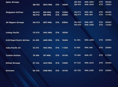(Eagle News) — The Manila International Airport Authority has released its list of operational commercial flights for Thursday, June 17: Flight schedules may change at any given time. Metro Manila is under a general community quarantine but with some restrictions. The travel ban on travelers from India, Pakistan, Sri Lanka, Oman and the United Arab Emirates has been extended until the end of the month.