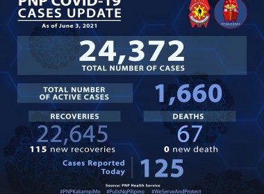 (Eagle News) — Over 100 more COVID-19 cases have been reported among police personnel. According to Philippine National Police data, the additional 125 cases pushed the PNP COVID-19 total to 24372. Of these, 1660 were active. Over 100–or 115–additional recoveries were also reported, pushing the PNP COVID-19 recoveries to 22645. No additional PNP COVID-19 deaths were reported, which means the PNP COVID-19 death toll remains at 67. Earlier, the PNP said its 67th COVID-19 fatality […]