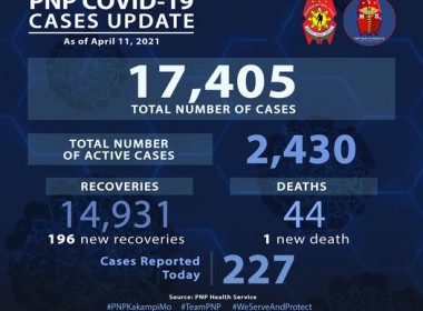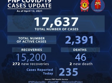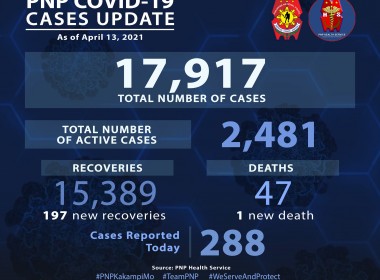 (Eagle News) — Over 200 more police personnel have tested positive for COVID-19. Data released by the Philippine National Police on Wednesday, April 14, showed the additional 288 cases pushed the PNP COVID-19 total to 17917. Of these, 2481 were active. Almost 200, or 197, more recoveries were reported, pushing the PNP COVID-19 recovery tally to 15389. An additional death also pushed the PNP COVID-19 death toll to 47. Earlier, the PNP announced PNP Chief […]