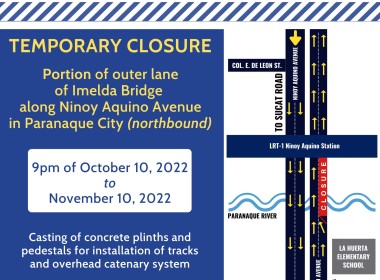 (Eagle News) — A portion of the outer lane of Imelda Bridge along Ninoy Aquino Avenue is temporarily closed. According to the Light Rail Manila Corporation, the closure of the bridge linking Barangays La Huerta and Sto. Niño is until November 10. It would pave the way for the casting of concrete plinths and pedestals for the installation of tracks and the overhead catenary system of the LRT-1 Ninoy Aquino Station. Only one lane remains […]