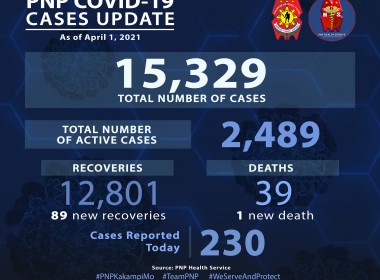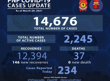 (Eagle News) — The Philippine National Police has reported 187 additional COVID-19 cases. According to PNP data released on Monday, March 29, the additional COVID-19 cases pushed the PNP COVID-19 tally to 14,456. Of these, 2,157 were active. Ninety-eight additional recoveries also pushed the PNP recovery tally to 12,262. No additional deaths were reported, which means the PNP COVID-19 death toll remains at 36. The Philippines is dealing with a surge in COVID-19 cases, prompting […]