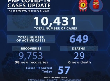 (Eagle News) — Thirty-eight more police personnel have recovered from COVID-19. The Philippine National Police said the additional recoveries pushed the PNP recovery total to 9753. Fifty-seven additional cases, however, also pushed the PNP COVID-19 total to 10431. Of these, 649 were active. No additional deaths were reported, which means the PNP death toll remains at 29. Uniformed personnel, including policemen, are among the priorities in a COVID-19 national vaccination program that is slated to […]