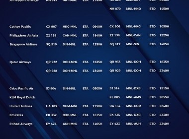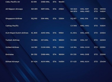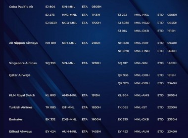(Eagle News) — The Manila International Airport Authority has released its list of operational commercial flights for Sunday, Feb. 7: Flight schedules may change at any given time. The Philippine government has eased travel restrictions on over 30 countries with reported COVID-19 variants. Starting Feb. 1, the Department of Foreign Affairs the following foreigners from the United Kingdom, Denmark, Ireland, Japan, Australia, Israel, the Netherlands, China, Hong Kong, Switzerland, France, Germany, Iceland, Italy, Lebanon, Singapore, […]