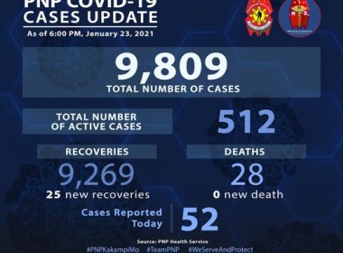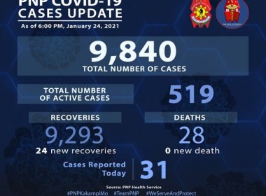 (Eagle News) — Twenty-four more police personnel have recovered from COVID-19. The Philippine National Police said the additional recoveries pushed the PNP COVID-19 recovery total to 9293. Thirty-one additional cases, however, brought the PNP COVID-19 taly to 9840. Of these, 519 were active. No additional deaths were reported, which means the PNP COVID-19 death toll remains at 28. The Philippine government has said it was eyeing COVID-19 vaccination of 50 to 60 percent of the […]