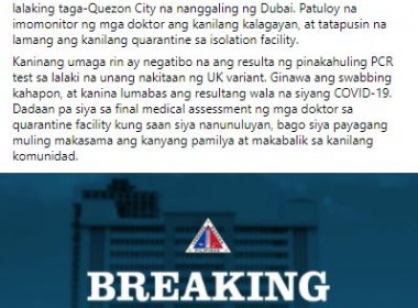 (Eagle News) — The mother and the girlfriend of the Quezon City resident who was found positive for the UK COVID-19 variant upon arrival from Dubai have tested negative for the variant. This is according to the Quezon City government, which made the announcement in a Facebook post on Friday night. “Patuloy na imomonitor ng mga doktor ang kanilang kalagayan, at tatapusin na lamang ang kanilang quarantine sa isolation facility,” the local government said. Earlier, […]