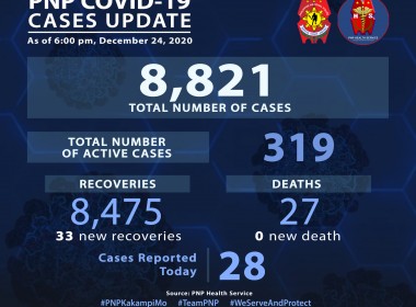 (Eagle News) — Thirty-three more policemen have recovered from COVID-19. The Philippine National Police said with the additional recoveries, the PNP COVID-19 recovery total rose to 8475. Twenty-eight additional COVID-19 cases, however, pushed the COVID-19 PNP total to 8821. Of these, 319 were active. No additional death was reported, which means the death toll remains at 27. The government has said uniformed personnel–including policemen–were among the priorities in a COVID-19 national vaccination program. The government […]