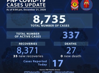 (Eagle News) — Thirty-five more police personnel have recovered from COVID-19. The Philippine National Police said with the additional recoveries, the PNP COVID-19 recovery total rose to 8371. Seventeen additional cases, however, pushed the total COVID-19 cases among police personnel to 8735. Of these, the PNP said 337 were active. No additional deaths were reported, which means the death toll remains at 27. The government has said it would prioritize uniformed personnel, including police personnel, […]