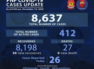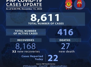 (Eagle News) — Thirty-two more police personnel have recovered from COVID-19. The Philippine National Police said with the additional recoveries, the total rose to 8168. Twenty-two more cases, however, pushed the total to 8611. Of these, 416 were active. No additional death was reported, which means the death toll remains at 27. The government has said uniformed personnel are among the priorities in a COVID-19 vaccination should a vaccine be available. Those include policemen, who […]