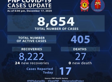 (Eagle News) — Twenty-four more police personnel have recovered from COVID-19. The Philippine National Police said with the additional recoveries, the PNP COVID-19 recovery total rose to 8222. Seventeen additional cases, however, pushed the PNP tally to 8654. Of these, 405 were active. No additional deaths were reported, which means the death toll remains at 27. The government has said uniformed personnel including policemen were among the priorities in a COVID-19 national vaccination program. The […]
