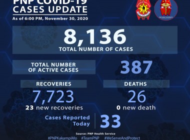(Eagle News) — Twenty-three more police personnel have recovered from COVID-19. The Philippine National Police said with the additional recoveries, the recovery total rose to 7723. Thirty-three additional COVID-19 cases pushed the total to 8136. Of these, 387 were active. No additional death was reported, which means the death toll remains at 26. The police remain among the country’s frontliners amid the COVID-19 pandemic. The PNP has said all police personnel on duty during the […]