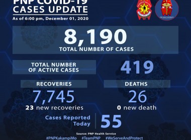 (Eagle News) — Twenty-three more police personnel have recovered from COVID-19. The Philippine National Police said with the additional recoveries, the recovery total rose to 7745. Fifty-five more COVID-19 cases, however, pushed the total number of COVID-19 cases in the PNP to 8190. Of these, the PNP said 419 were active. No additional deaths were reported, which means the PNP COVID-19 death toll was still at 26. The Department of Health has said COVID-19 cases […]