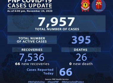(Eagle News) — Sixty-six more police personnel have recovered from COVID-19. The Philippine National Police said with the additional recoveries, the recovery total rose to 7536. Sixty-six additional COVID-19 cases, however, pushed the total to 7957. Of these, 395 were active. No additional death was reported, which means the death toll remained at 26. The PNP has inked an agreement with the Makati Medical Center to ensure medical services for police personnel amid the COVID-19 […]