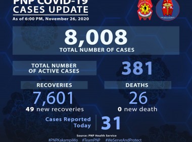 (Eagle News) — Forty-nine more police personnel have recovered from COVID-19. With the additional recoveries, the Philippine National Police said the total recoveries in the organization rose to 7601. Thirty-one additional COVID-19 cases pushed the total to 8008. Of these, 381 were active. No additional deaths were reported, which means the death toll remains at 26. The PNP has said all policemen on modified enhanced community quarantine and enhanced community quarantine were entitled to COVID-19 […]
