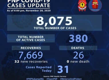 (Eagle News) — Thirty-two more police personnel have recovered from COVID-19. The Philippine National Police said with the additional recoveries, the recovery total rose to 7669. Thirty-one more additional cases pushed the total to 8075. Of these, 380 were active. There was no additional death reported, which means the death toll remains at 26. The police are among the country’s frontliners amid the COVID-19 pandemic. The PNP has said all policemen on modified enhanced community […]