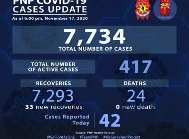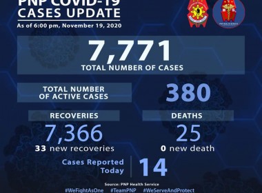 (Eagle News)–Thirty-three more police personnel have recovered from COVID-19. The recovery total rose to 7366 with the additional recoveries, the PNP said. Fourteen additional cases pushed the COVID-19 total to 7771. Of these, 380 were active. The death toll was so far at 25, with no additional deaths reported. The police are still among the country’s frontliners as they continue to enforce laws. The PNP has vowed to ensure the protection of its personnel, and […]