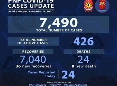 (Eagle News)–Sixteen more police personnel have recovered from COVID-19. The Philippine National Police said as a result, the PNP COVID-19 tally as of Monday night rose to 7056. Thirty new COVID-19 cases, however, pushed the total to 7520. Of these, the PNP said 440 were active. The death toll, the PNP said, was still at 24, with no additional deaths reported. The police remain among the country’s frontliners amid the COVID-19 pandemic. The government has […]