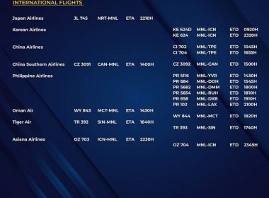 (Eagle News)–The Manila International Airport Authority has released its list of operational commercial flights for Thursday, Nov. 12: MIAA said flight schedules may be subject to changes. On Wednesday, MIAA said flight operations had been suspended at NAIA from midnight to Thursday, Nov. 12, at 6 a.m., due to Typhoon “Ulysses.” “Ulysses” made its second landfall over Burdeos, Quezon on Wednesday night.