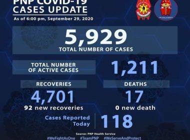 (Eagle News)–The Philippine National Police reported on Tuesday night almost 100 COVID-19 recoveries. The PNP said with the 92 more recoveries, the tally rose to 4701 as of 6 p.m. Over 100, or 118, new COVID-19 cases, however, pushed the COVID-19 total to 5929. Of these, the PNP said 1211 were active. There were still no additional COVID-19 deaths reported, which means the death toll remains at 17. The police are among the country’s frontliners […]