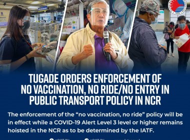 (Eagle News) – The Department of Transportation ordered the immediate enforcement of the “no vaccination, no ride/no entry” policy in all public transportation and related facilities in Metro Manila. Transportation Secretary Arturo Tugade said this was in line with President Rodrigo Duterte’s order to restrict the movement of the unvaccinated in view of the exponential rise in COVID-19 cases in Metro Manila. Tugade’s order was issued on January 11, 2022, a day after President […]