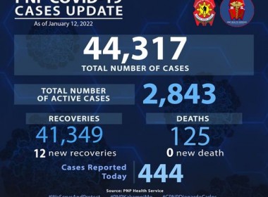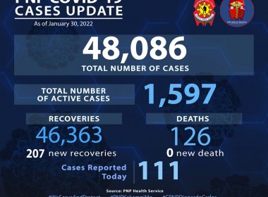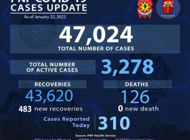 (Eagle News)–Detected COVID-19 cases among police personnel breached the 47,000 mark on Saturday, Jan. 22. The 47,024 COVID-19 tally was after the Philippine National Police reported 310 additional cases within its ranks. Of the total cases, the PNP said 3278 were active. Recoveries rose to 43620 with the additional 483 recoveries. The COVID-19 death toll among police personnel is at 126, after one additional death was reported on Jan. 19. The police are among the […]