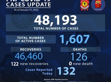 (Eagle News) — COVID-19 cases among police personnel have climbed to 48,193. According to the Philippine National Police, this was after 132 more COVID-19 cases were reported within their ranks. The PNP data showed of the total cases, 1607 were active. Over 100, or 122, more recoveries were also reported. With the additional recoveries, the PNP COVID-19 recovery tally is now at 46,460. No additional deaths were reported, which means the PNP COVID-19 death toll […]