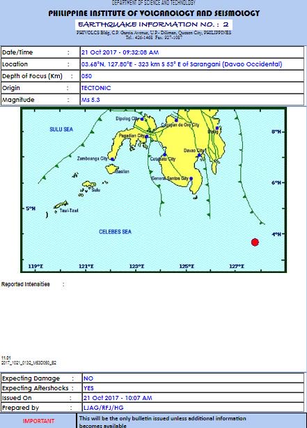(Eagle News) -- A 5.3-magnitude earthquake struck Davao Occidental on Saturday. The Philippine Institute for Volcanology and Seismology said the…