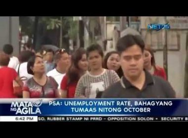 MANILA, Philippines (Eagle News) — Bahagyang tumaas ang unemployment rate ng bansa nitong Oktubre 2017 kumpara sa kaparehong panahon noong 2016. Ayon sa Philippine Statistics Authority, tinatayang nasa 5.0 percent ang unemployed na mga Pilipino. Bahagya itong tumaas kumpara sa 4.7 percent na naitala sa kaparehong panahon noong nakaraang taon. Katumbas ito ng 2.2 million Filipinos at 2 million naman noong nakaraang taon. https://youtu.be/Gu5t07J_4CA