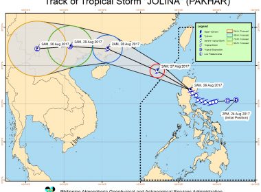 (Eagle News) — Tropical Storm Jolina has slightly weakened and is now in the vicinity of Ifugao province after making landfall over Casiguran, Aurora Friday night. As of 5 a.m. Saturday (August 26), PAGASA says Jolina’s estimated rainfall is from moderate to heavy within its 300 kilometer-diameter. It was in the vicinity of Aguinaldo Ifugao as of 4 a.m. It has maximum sustained winds of up to 75 kilometers per hour near the center […]