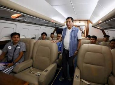 In these photos made available by the Presidential Communications Operations Office, President Rodrigo Duterte is seen on board the presidential plane with nine soldiers who were wounded in Marawi. The nine soldiers were taken by the President on a presidential flight from Cagayan de Oro to Manila, where they were to undergo medical treatment.