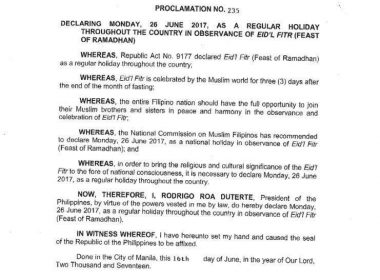 QUEZON CITY, Philippines (Eagle News) — Another long weekend is coming up. Malacanang on Friday declared June 26, Monday, as a regular holiday in the country. Proclamation No. 235, signed by President Rodrigo Duterte, said that the declaration was made in observance of Eid’l Fitr, an important Muslim holiday. The declaration was made upon the recommendation of the National Commission on Muslim Filipinos. Below is the copy of the declaration: